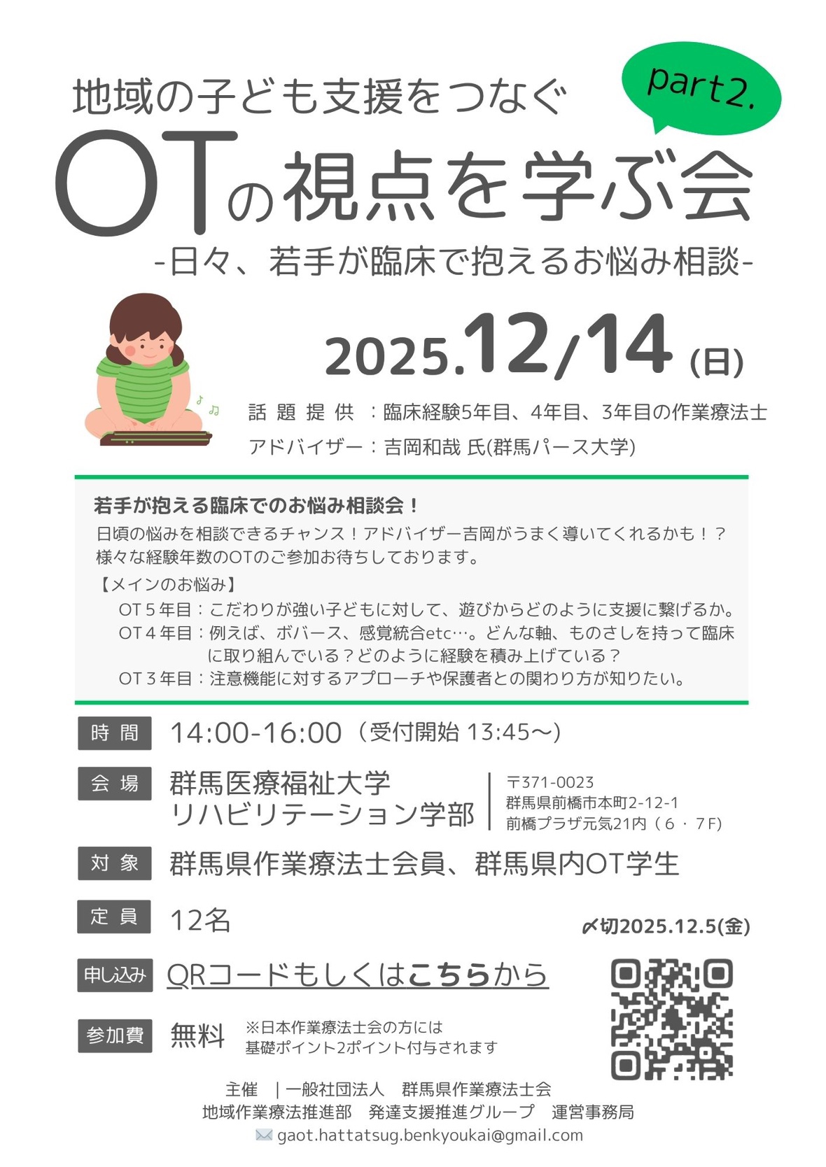 [研 修]2025/12/14(日)地域の子ども支援をつなぐOTの視点を学ぶ会part2 -日々、若手が臨床で抱えるお悩み相談会-