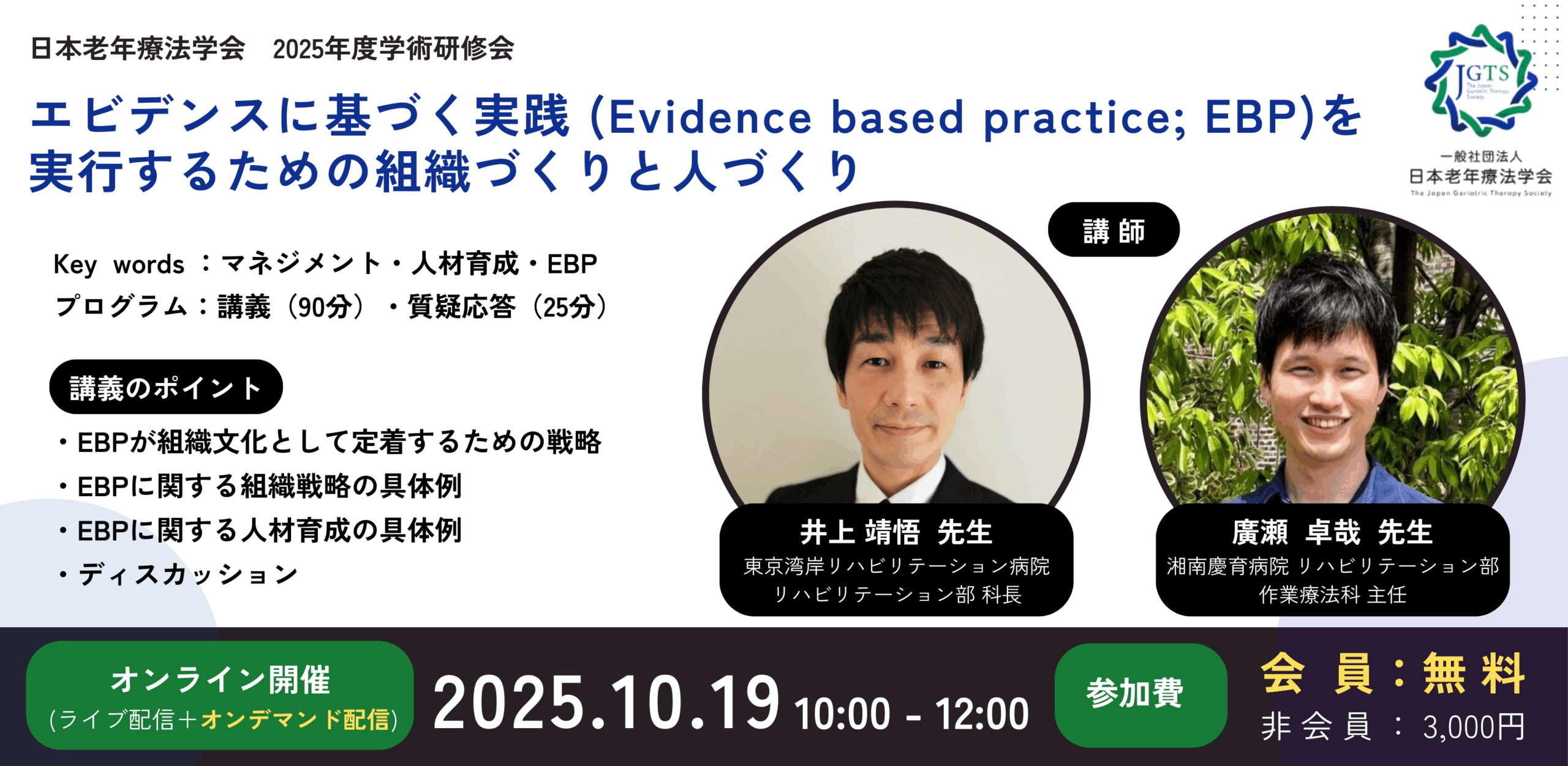 [研 修]2025/10/19(日)2025年度 第2回学術研修会 エビデンスに基づく実践 (Evidence based practice; EBP)を実行するための組織づくりと人づくり