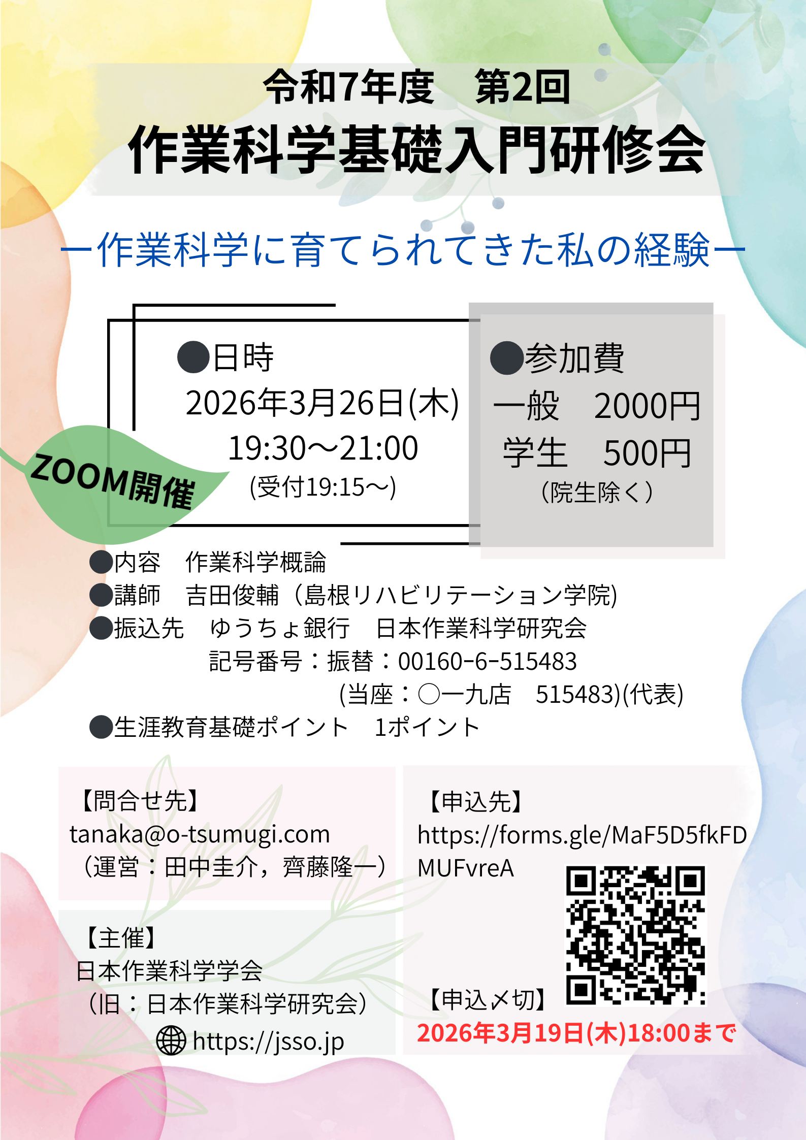[研 修]2026/3/26(木)第2回作業科学基礎入門研修会New!!